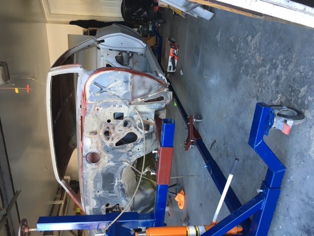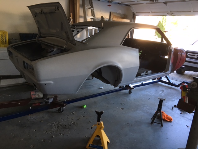 After I finished the bottom, I took the body off of the rotisserie and placed it on jack stands. My painter then came out and painted the fire wall, inside the doors, the jams, and inside the trunk lid.
