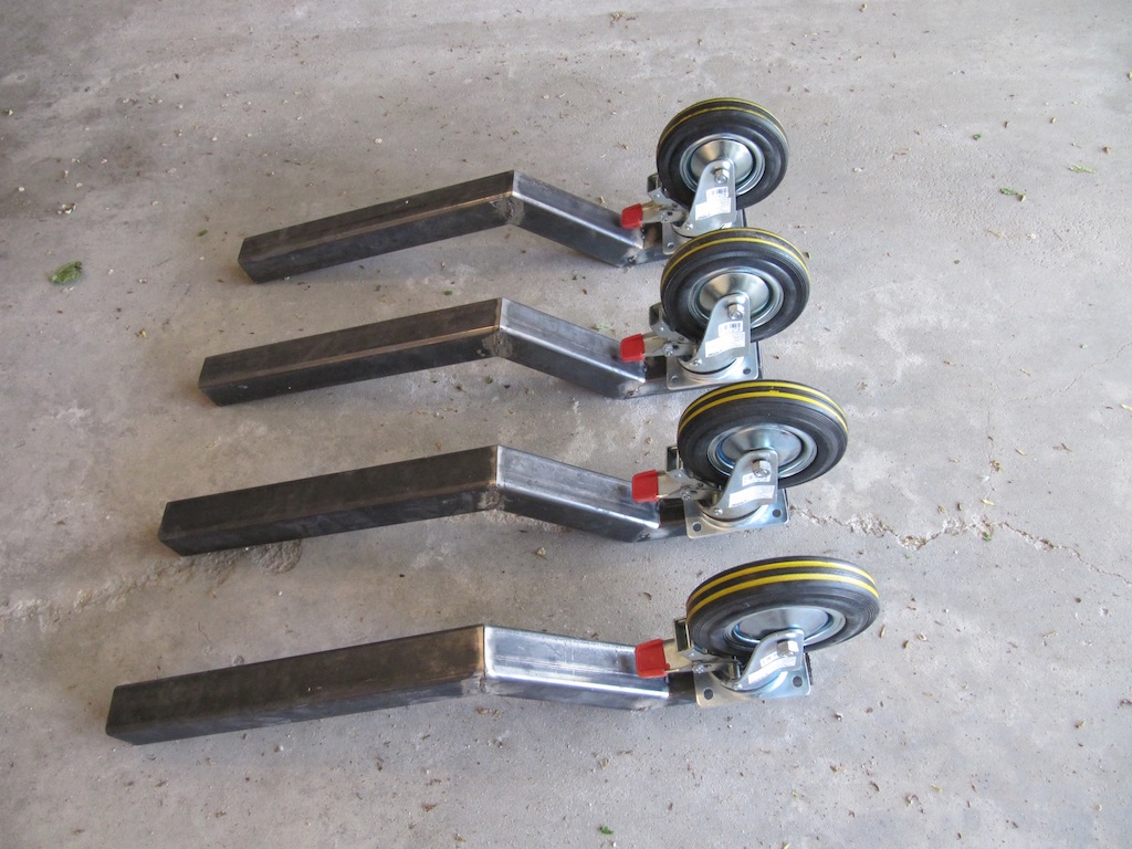 I took the steel home, drilled the required holes and tacked it together with my little MIG welder. I took the pieces to Extreme Machine on Hutchings Street where they arc welded all the joins with a 1/4 inch seam. I purchased the caster wheels from Harbor Freights in US.